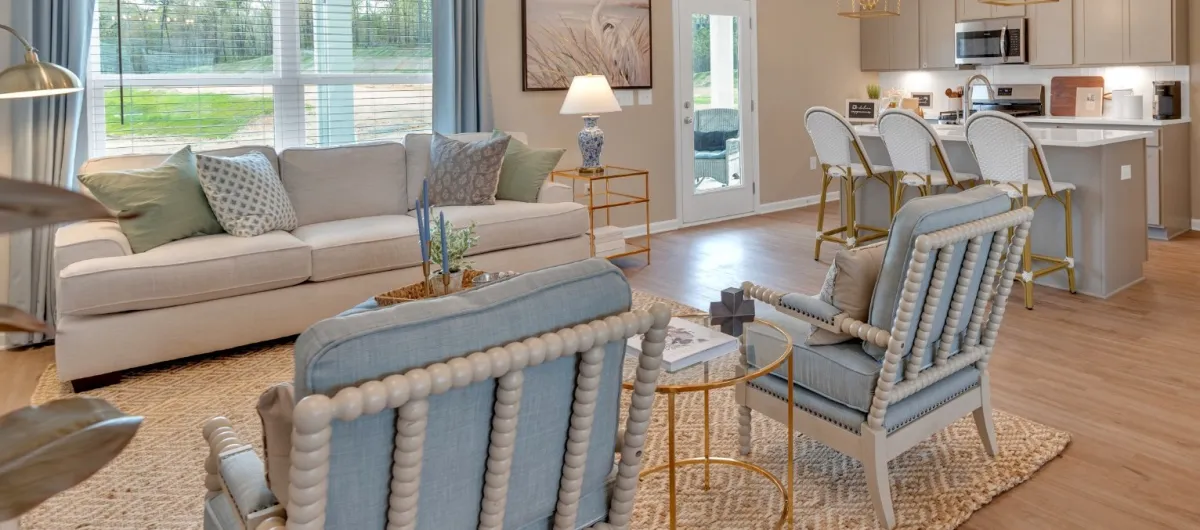 The Blossom plan flows effortlessly with flex spaces and open concept living. Enjoy a private primary suite and plentiful storage. A chef's island kitchen overlooks the living space, making entertaining and casual living ideal. Images for representative purposes only.